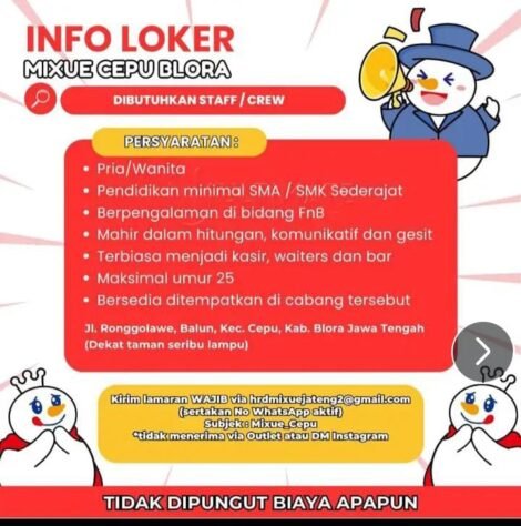 Berita Lowker 🍦 INFO LOWONGAN KERJA MIXUE CEPU BLORA TERBARU! Oleh Nur Khoirunnisa • 13.10.2025 • 7 Dilihat • Cepu, Mustikatimes.com – Mixue Cepu Blora membuka kesempatan emas bagi Anda yang energik, komunikatif, dan...