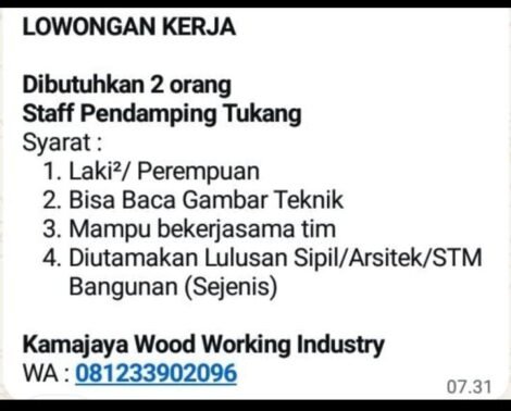 Berita Lowker Lowongan Kerja di Kamajaya Wood Working Industry Oleh Nur Khoirunnisa • 01.10.2025 • 6 Dilihat • MUSTIKATIMES.COM – Kamajaya Wood Working Industry sedang mencari kandidat yang berbakat dan bersemangat untuk bergabung...