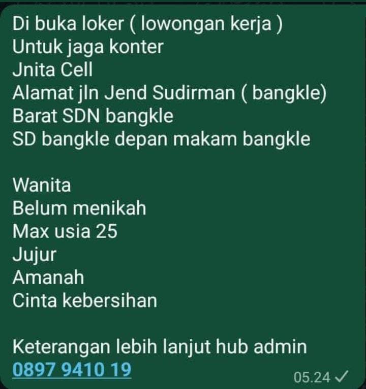 Jika Anda adalah wanita muda yang jujur, amanah, menyukai kebersihan, dan mencari lowongan kerja di Bangkle atau loker jaga konter, ini adalah kesempatan Anda.