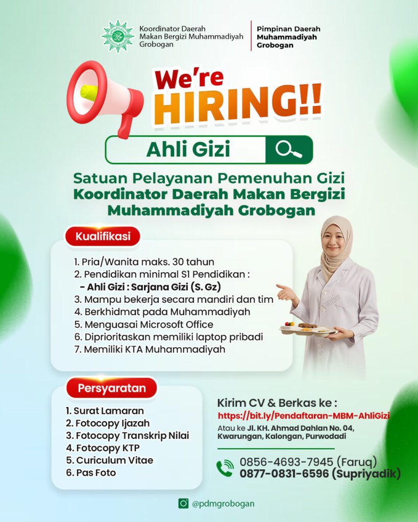 MUSTIKATIMES.COM – Kesempatan emas bagi Anda para ahli gizi! Koordinator Daerah Makan Bergizi Muhammadiyah Grobogan sedang mencari individu yang berdedikasi untuk bergabung sebagai Ahli Gizi. Ini adalah kesempatan untuk berkontribusi dalam tim pelayanan gizi yang profesional dan berdampak.