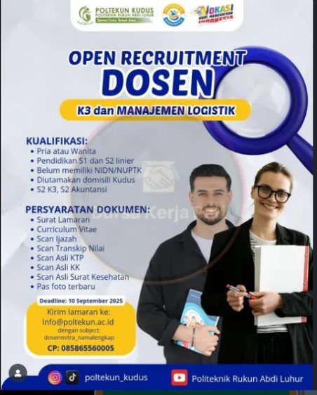 KUDUS, MUSTIKATIMES.COM – Politeknik Rukun Abdi Luhur Kudus membuka kesempatan bagi Anda yang berdedikasi tinggi untuk bergabung sebagai dosen tetap. Posisi yang tersedia adalah untuk dua bidang studi: K3 dan Manajemen Logistik.