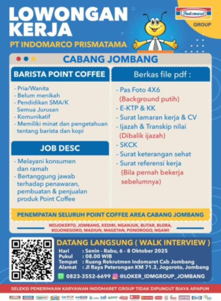 Jombang, MUSTIKATIMES.COM – Anda punya passion di dunia kopi dan hospitality? PT Indomarco Prismatama (Indomaret Group) Cabang Jombang membuka peluang karir menarik sebagai Barista Point Coffee.