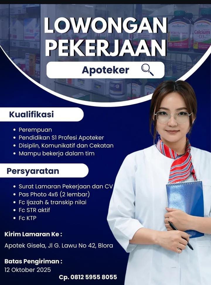BLORA, MUSTIKATIMES.COM – Cari lowongan kerja Apoteker di Blora? Apotek Gisela adalah tempatnya! Kami membuka kesempatan bagi Anda, seorang Apoteker profesional, untuk bergabung dan tumbuh bersama kami. Posisi ini terbuka untuk lulusan S1 Profesi Apoteker yang memiliki STR aktif dan berdomisili di Blora atau sekitarnya.