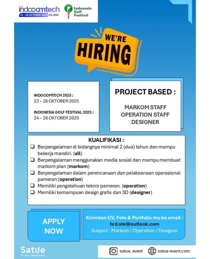 Jangan lewatkan kesempatan ini untuk berkarir dan berkontribusi di industri event bersama tim profesional di SATUE. Kami tunggu lamaran terbaik Anda!