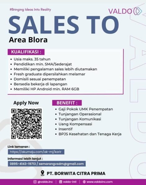 Berita Lowker Valdo (PT. Borwita Citra Prima) Membuka Lowongan SALES TO (Area Blora) Oleh Nur Khoirunnisa • 15.10.2025 • 2 Dilihat • BLORA, MUSTIKATIMES.COM – #BringingIdeasIntoReality! Valdo, melalui PT. Borwita Citra Prima, sedang mencari talenta sales terbaik...