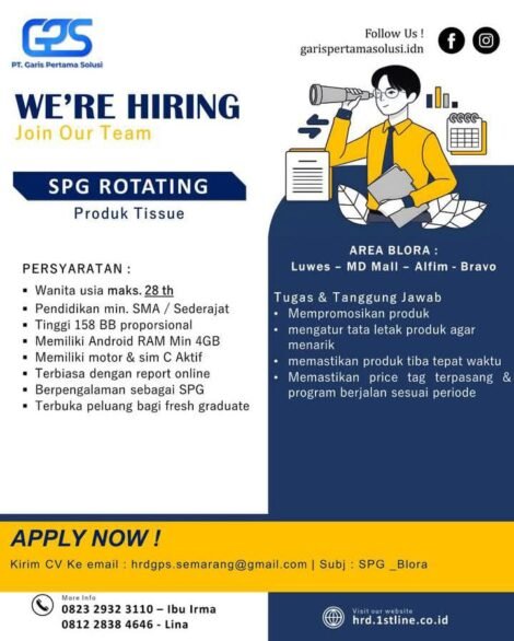 Berita Ekonomi & Bisnis Lowker Lowongan Kerja SPG Rotating Produk Tissue di Blora: Kesempatan Bagi Fresh Graduate dan Berpengalaman! Oleh Nur Khoirunnisa • 15.10.2025 • 4 Dilihat • MUSTIKATIMES.COM – WE’RE HIRING! PT. Garis Pertama Solusi (GGS) mengundang Anda untuk bergabung sebagai SPG...