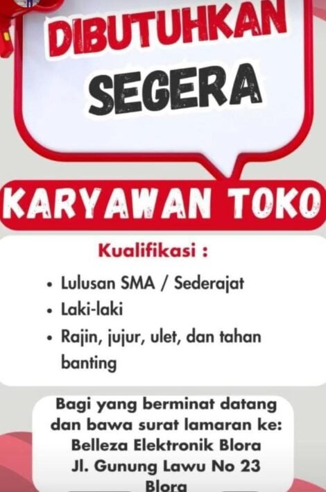 Berita Lowker Lowongan Kerja Terbaru Blora: Kesempatan Menarik Jadi Karyawan Toko di Belleza Elektronik! Oleh Nur Khoirunnisa • 15.10.2025 • 2 Dilihat • BLORA, MUSTIKATIMES.COM – Cari pekerjaan di Blora? Belleza Elektronik sedang mencari talenta terbaik untuk bergabung...