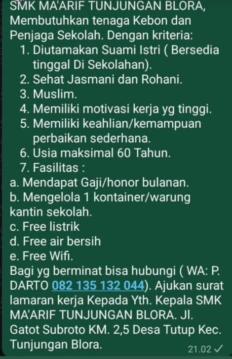 Berita Lowker Lowongan Kerja Suami Istri di Blora: Tenaga Kebun dan Penjaga Sekolah SMK Ma’arif Tunjungan Oleh Nur Khoirunnisa • 15.10.2025 • 4 Dilihat • Blora, MUSTIKATIMES.COM – Kesempatan Emas! SMK Ma’arif Tunjungan Blora mencari pasangan suami istri yang berdedikasi...